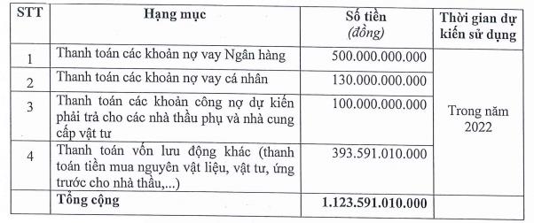 Số vốn thu về nếu C4G thành công bán hết lượng cổ phiếu mới là gần 1.124 tỷ đồng, sẽ được phân bổ gồm 500 tỷ đồng thanh toán các khoản nợ vay ngân hàng, 130 tỷ đồng thanh toán các khoản nợ vay cá nhân; 100 tỷ đồng thanh toán các khoản công nợ dự kiến phải trả cho các nhà thầu phụ và nhà cung cấp vật tư; còn lại gần 394 tỷ đồng nhằm bổ sung vốn lưu động (thanh toán tiền mua NVL, vật tư, ứng trước cho nhà thầu...)