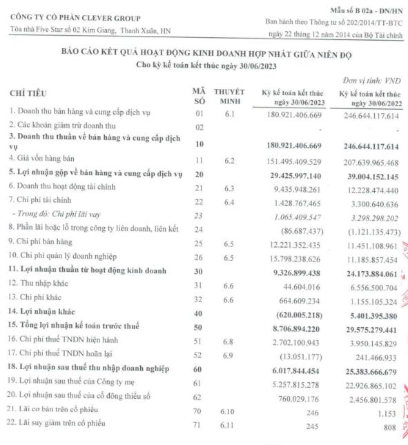 Về bức tranh tài chính, theo báo cáo kinh doanh hợp nhất giữa niên độ 2023, Clever Group ghi nhận 180,9 tỷ đồng doanh thu thuần hợp nhất, giảm 27% so với cùng kỳ.