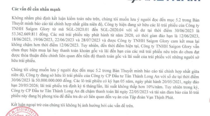 Đáng chú ý, tại báo cáo soát xét bán niên 2023, kiểm toán viên cũng có ý kiến nhấn mạnh đối với các khoản đầu tư trái phiếu đã đến kỳ đáo hạn của Công ty.