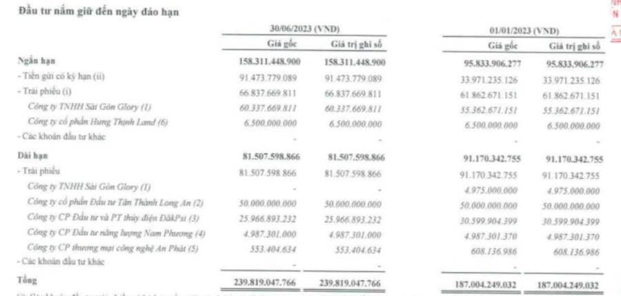 Ngoài khoản đầu tư bất động sản, doanh nghiệp còn dành hơn nửa tổng tài sản cho hoạt động đầu tư tài chính. Cụ thể, tại thời điểm cuối quý II/2023, giá trị khoản đầu tư tài chính (cả ngắn hạn và dài hạn) của Công ty là 239,8 tỷ đồng.