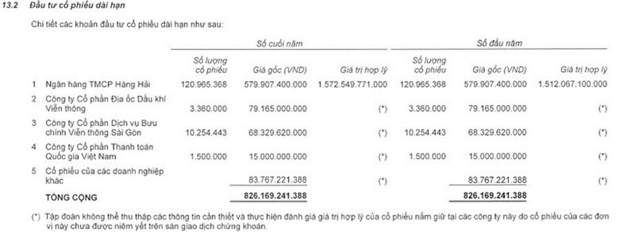 VNPT còn cầm hơn 1.300 tỷ đồng đi đầu tư, trong đó rót 826 tỷ đồng vào thị trường chứng khoán Việt Nam. Trong đó, khoản lớn nhất là đầu tư vào cổ phiếu MSB của ngân hàng TMCP Hàng Hải (MSB), với số tiền gần 580 tỷ đồng.