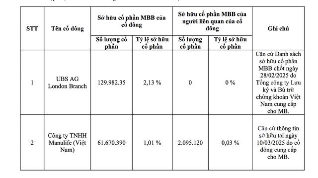 Cụ thể, theo thông tin công bố ngày 18/03/2025, UBS AG London Branch hiện đang sở hữu gần 130 triệu cổ phiếu MBB, tương đương 2,13% vốn điều lệ ngân hàng. Trong khi đó, Manulife Việt Nam nắm giữ hơn 61,67 triệu cổ phiếu MBB, chiếm 1,01% vốn. Một cá nhân có liên quan đến Manulife Việt Nam cũng đang sở hữu hơn 2 triệu cổ phiếu MBB, chiếm 0,03% vốn.