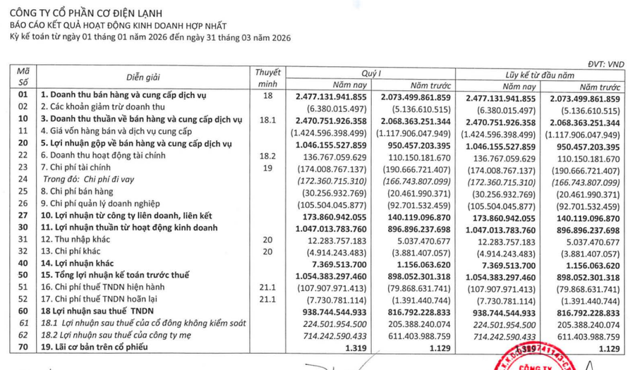 CTCP Cơ điện lạnh (mã ck: REE) vừa công bố kết quả kinh doanh quý I/2026 với nhiều con số tăng trưởng.