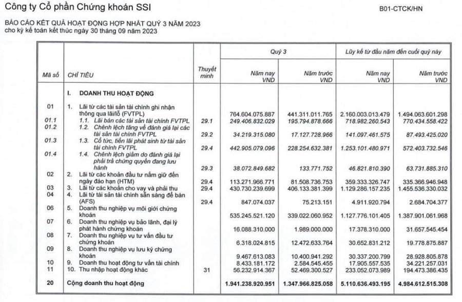 Về tình hình kinh doanh, trong quý III/2023, SSI ghi nhận doanh thu hoạt động đạt 1.941 tỷ đồng, tăng 44% so với cùng kỳ năm trước.