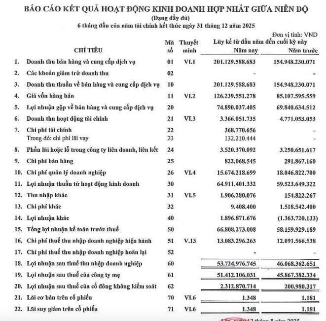 Theo báo cáo bán niên 2025 đã soát xét, trong nửa đầu năm 2025, Công ty đạt kỷ lục hơn 201 tỷ đồng doanh thu thuần và lãi sau thuế đạt 53,7 tỷ đồng, lần lượt tăng 30% và 16% so với cùng kỳ.
