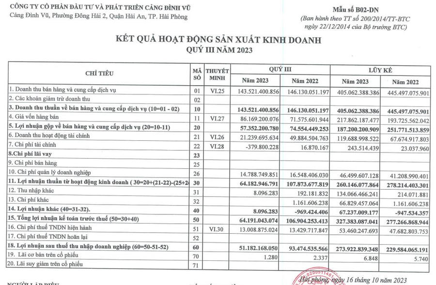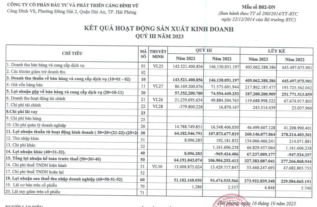 Về kết quả kinh doanh, quý III/2023, Cảng Đình Vũ ghi nhận doanh thu thuần đạt 143,5 tỷ đồng, giảm 2% so với cùng kỳ năm ngoái.