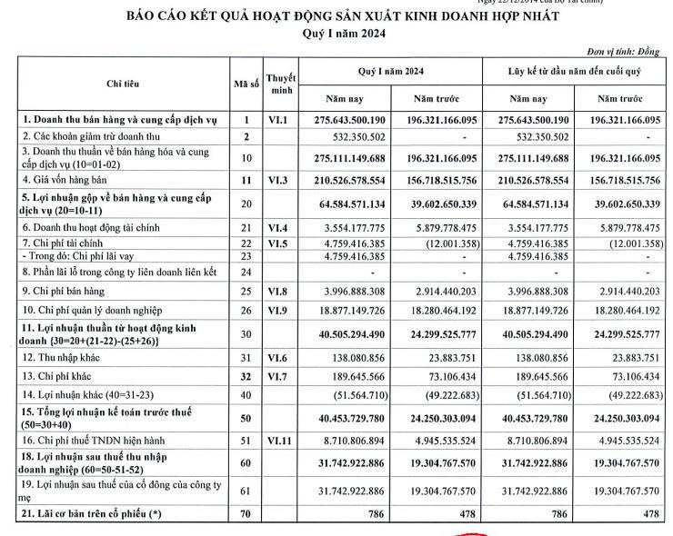 Về kết quả kinh doanh, quý I/2024, QNP ghi nhận doanh thu thuần đạt 275,1 tỷ đồng, tăng 40% so với cùng kỳ. Lợi nhuận gộp của QNP tăng 63% lên mức 64,5 tỷ đồng.