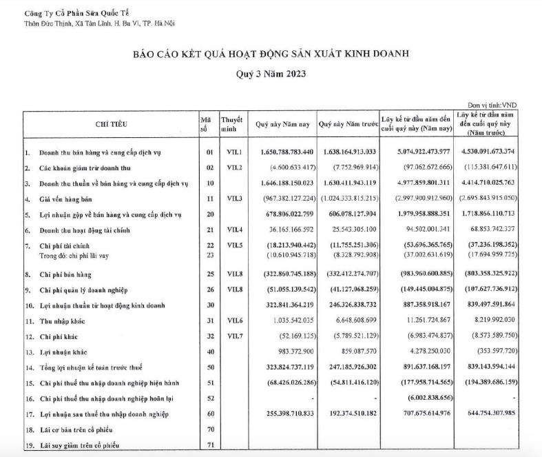 Về kết quả kinh doanh, quý III/2023, Công ty Sữa Quốc tế ghi nhận doanh thu thuần đạt 1.646 tỷ đồng, tăng nhẹ 1% so với cùng kỳ.