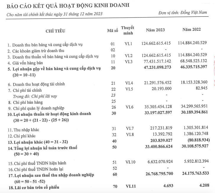 Kết thúc năm 2023, TVH ghi nhận tổng doanh thu 124,6 tỷ đồng, tăng 9% so với năm trước. Lợi nhuận sau thuế đạt cột mốc mới với 26,77 tỷ đồng.