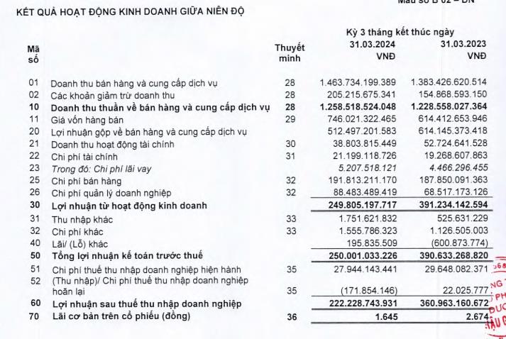 Giá vốn hàng bán cũng tăng lên mức 746 tỷ đồng so với mức 614 tỷ đồng hồi quý I/2023. Lợi nhuận gộp về bán hàng giảm về mức 512,4 tỷ đồng, thấp hơn 16% so với cùng kỳ.