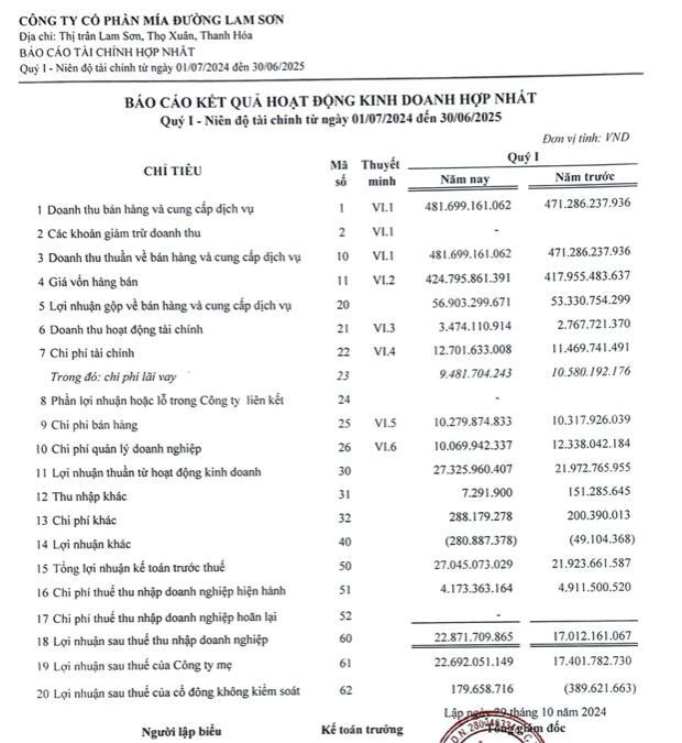 Trong quý I niên độ 2024-2025, Lasuco ghi nhận doanh thu thuần đạt 481,6 tỷ đồng, tăng hơn cùng kỳ 2,2%; lãi sau thuế đạt 22,8 tỷ đồng, tăng 30% so với cùng kỳ năm ngoái.