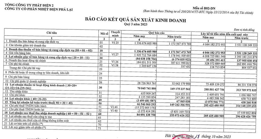 Về kết quả kinh doanh, trong quý III/2023, Nhiệt điện Phả Lại ghi nhận doanh thu đạt 1.336,6 tỷ đồng, tăng 14% so với cùng kỳ.