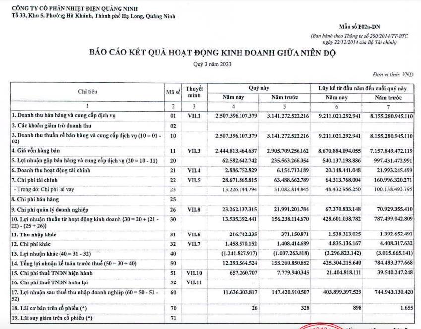 Khấu trừ chi phí, giá vốn, lợi nhuận sau thuế của QTP trong quý III/2023 đạt 11,6 tỷ đồng, giảm 92% so với cùng kỳ.