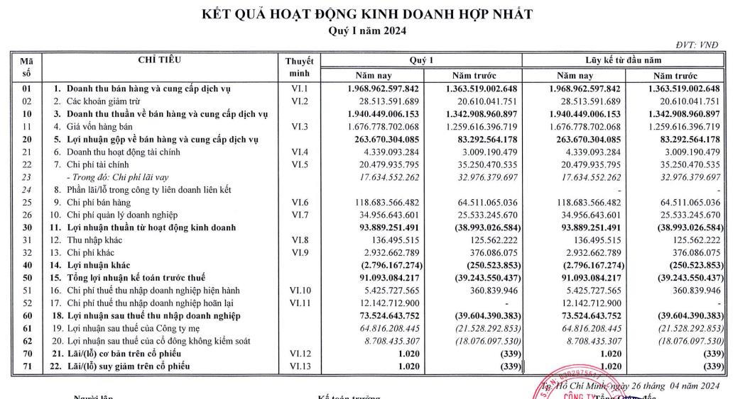 Theo đó, trong quý I/2024, doanh nghiệp đạt 1.940,4 tỷ đồng doanh thu, tăng 46% so với cùng kỳ. Lợi nhuận sau thuế đạt 73,5 tỷ đồng, trong khi cùng kỳ năm ngoái báo lỗ 39,6 tỷ đồng.
