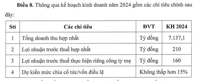 Tại Đại hội đồng cổ đông 2024, công ty đặt mục tiêu tổng doanh thu hợp nhất là 7.137 tỷ đồng, lợi nhuận sau thuế hợp nhất 210 tỷ đồng.