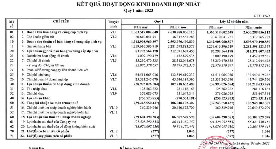 Trong kỳ, giá vốn hàng bán giảm 45% về 1.260 tỷ đồng, lợi nhuận gộp giảm mạnh tới 73% về 83,2 tỷ đồng.