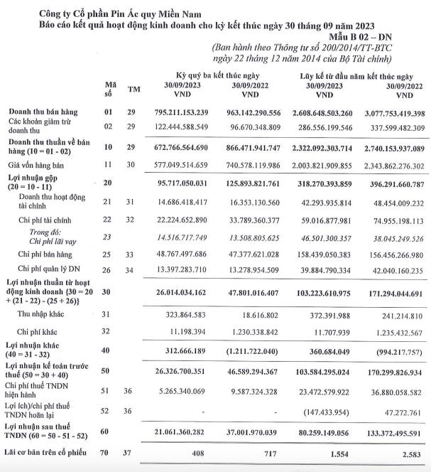 Lũy kế 9 tháng đầu năm 2023, doanh thu thuần đạt 2.322 tỷ đồng, giảm 15% so với cùng kỳ; lợi nhuận sau thuế giảm 40% về 80,3 tỷ đồng.