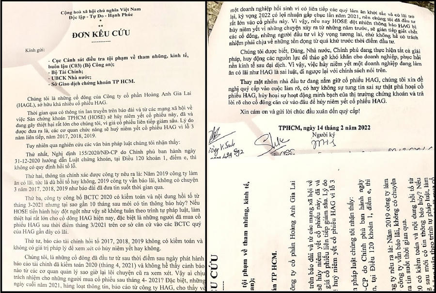 Cuối đơn, nhóm nhà đầu tư đang nắm giữ cổ phiếu HAG đề nghị cơ quan chức năng vào cuộc làm rõ, có hay không việc tung tin sai sự thật phá hoại cổ phiếu HAG, hủy hoại sự hoạt động minh bạch của thị trường chứng khoán và trả lời rõ cho cổ đông nếu hủy niêm yết cổ phiếu HAG thì căn cứ vào đâu, quy định, điều luật nào để hủy?