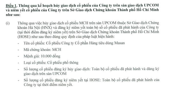 Theo nghị quyết, Đại hội đồng cổ đông của Masan Consumer thông qua kế hoạch hủy giao dịch của cổ phiếu MCH trên sàn giao dịch UPCOM và niêm yết tại Sở Giao dịch Chứng khoán TP HCM (HOSE).