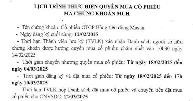 Ở một diễn biến khác có liên quan, Masan Consumer đang trong quá trình chào bán 326,8 triệu cổ phiếu ra công chúng, tương đương tỷ lệ 45,1% số cổ phiếu đang lưu hành. Thời gian đăng ký mua và nộp tiền mua cổ phiếu từ ngày 18/2 - 10/3/2025.