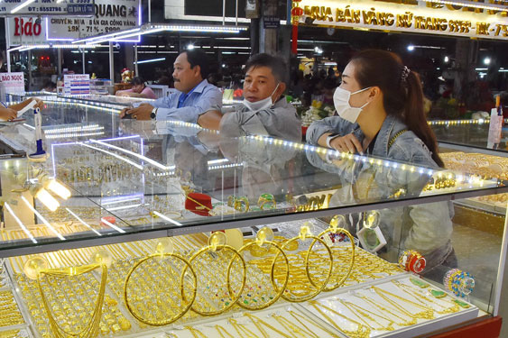 Ở thị trường trong nước, những ngày qua, khi giá vàng thế giới lập đỉnh lịch sử 2.080 USD/ounce, vàng SJC cũng liên tục phá kỷ lục. Trong những thời điểm nóng sốt, giá vàng SJC cao hơn thế giới khoảng 3-4 triệu đồng/lượng, chênh lệch giá mua - bán tăng cao bất thường. Đại diện một công ty vàng khá lớn ở TP HCM cho hay những ngày qua, giao dịch vàng khá ảm đạm, nhu cầu không tăng đột biến nhưng do giá vàng thế giới liên tục biến động mạnh nên doanh nghiệp phải nới rộng biên độ chênh lệch để phòng thủ.