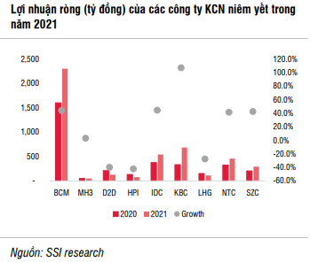 Theo đơn vị nghiên cứu, các khu công nghiệp với diện tích cho thuê còn lại lớn như SZC, IDC, BCM, NTC và KBC được kỳ vọng sẽ tăng trưởng tích cực trong năm 2021. Ngược lại, HPI và LHG có thể ghi nhận giảm lợi nhuận do vướng mắc trong công tác đền bù và giải tỏa mặt bằng.