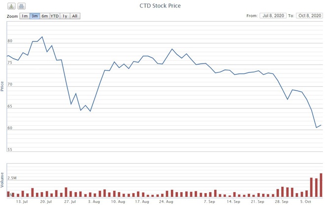 CTD cũng gây bất ngờ trong phiên hôm nay khi chấm dứt chuỗi 5 phiên giảm liên tục liền trước, trong đó có 2 phiên giảm mạnh sau thông tin ông Nguyễn Bá Dương rời Coteccons. Đóng cửa phiên 8/10, cổ phiếu CTD tăng 1%, dừng ở thị giá 61.100 đồng/cổ phiếu. Mã này thậm chí có thời điểm vọt lên sát mức giá trần khi mở cửa trước khi bị thu hẹp biên độ tăng điểm.