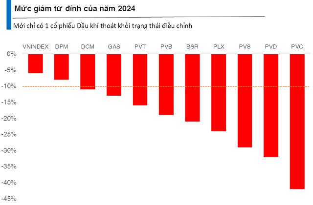 Trong giai đoạn kém tích cực của thị trường chứng khoán cuối năm 2024, các cổ phiếu dầu khí cũng không thoát được những diễn biến bất lợi. Nếu như chỉ số VN-Index đang giảm từ đỉnh của 6-7% thì hầu hết nhóm cổ phiếu dầu khí lại đang đều đã ở trong trạng thái điều chỉnh (giảm 10-20%) hoặc thậm chí ở trong thị trường con gấu (giảm trên 20%).