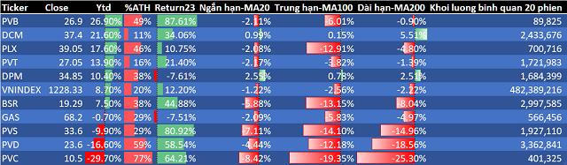 Một số mã đã có mức giảm 10-20% từ đỉnh của năm (Drawdown) như DCM (-11%), GAS (-13%), PVT (-16%), PVB (-19%) trong khi đó, các mã BSR (-21%), PLX (-24%), PVS (-29%), PVD (-32%), PVC (-42%) đã giảm trên 20%. Trong đó, GAS, PVD, BSR, PVC, PLX là những cổ phiếu đã tuột dốc nhanh nhất trong thời gian gần đây.