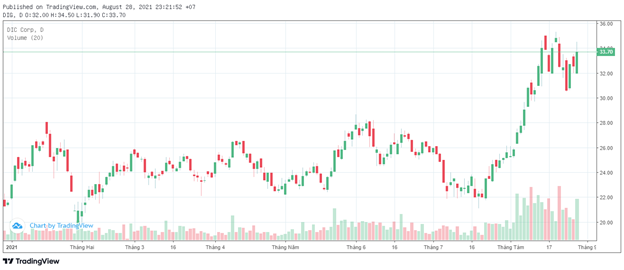 Động thái tranh thủ chốt lời của các cổ đông lớn diễn ra trong bối cảnh cổ phiếu DIG liên tục tăng nóng thời gian gần đây. Hiện cổ phiếu này đang giao dịch quanh vùng đỉnh với 33.700 đồng/cổ phiếu, tăng 53% trong hơn 1 tháng. Tạm tính tại mức thị giá này, vốn hóa của DIC Corp vào khoảng 13.500 tỷ đồng.