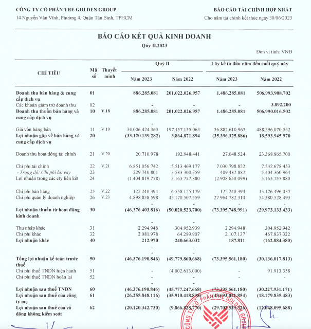 Về kết quả kinh doanh, theo báo cáo tài chính hợp nhất tự lập của The Golden Group, lũy kế 6 tháng đầu năm, doanh thu thuần của TGG ghi nhận 1,4 tỷ đồng, giảm 99,7% so với cùng kỳ ghi nhận tại 506,9 tỷ đồng.