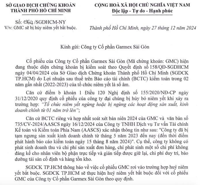 Sở Giao dịch Chứng khoán TPHCM (HOSE) vừa thông báo sẽ thực hiện hủy niêm yết bắt buộc đối với cổ phiếu Công ty cổ phần Garmex Sài Gòn (mã ck: GMC) theo quy định.
