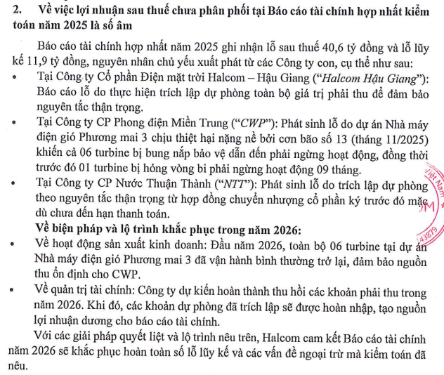 Về khoản lỗ sau thuế 40,6 tỷ đồng ghi nhận trong 2025 và lỗ lũy kế 11,9 tỷ đồng, Halcom xác định nguyên nhân chủ yếu đến từ ba công ty con. Cụ thể, Công ty cổ phần Điện mặt trời Halcom - Hậu Giang ghi nhận lỗ do trích lập dự phòng toàn bộ giá trị khoản phải thu theo nguyên tắc thận trọng.