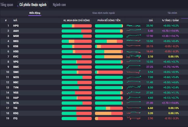 Tuy nhiên, bước sang phiên chiều, lực cầu lan tỏa khá mạnh giúp nhiều nhóm ngành tăng điểm tích cực. Gây chú ý nhất là nhóm cổ phiếu nguyên vật liệu, đặc biệt là cổ phiếu khoáng sản khi hàng loạt mã như AAH, MSR, MTA, KCB, KSV tăng trần.