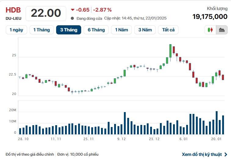 Cụ thể, kết phiên 22/01, giá cổ phiếu HDB của Ngân hàng HDBank ở mức 22.000 đồng/cổ phiếu, giảm 2,87% so với phiên trước, khối lượng cổ phiếu giao dịch khớp lệnh đạt gần 19,2 triệu đơn vị.