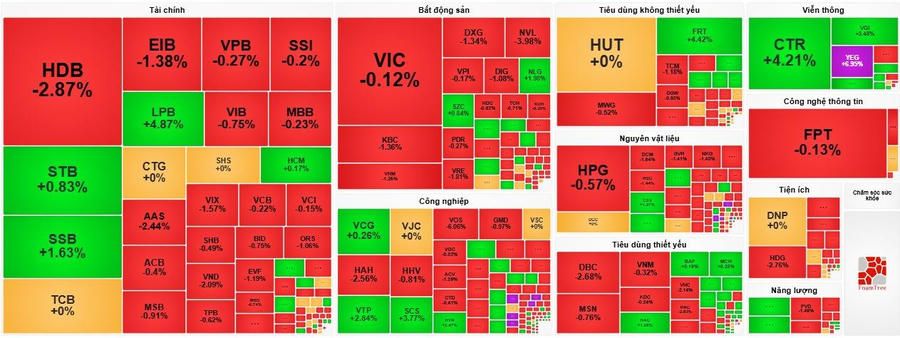 Tương tự, nhóm cổ phiếu bất động sản cũng “chìm” trong sắc đỏ, với VIC -0,12%, VHM -1,25%, VRE -1,81%, KBC -1,36%, DXG -1,34%, NVL -3,98%, DIG -1,08%, BCM -1,89%, IDC -1,1%, …