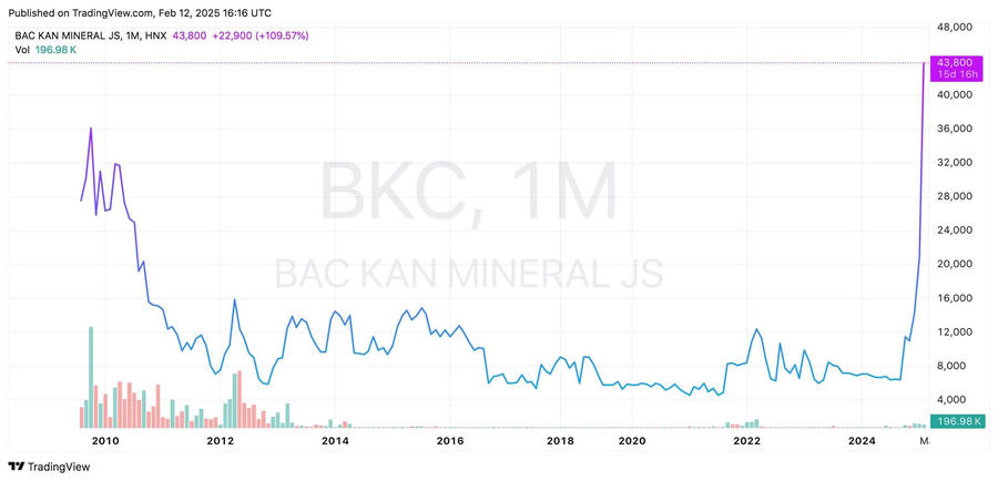 Đáng chú ý, từ vùng 14.400 đồng hồi giữa tháng 1/2025, thị giá BKC đã bật tăng tới hơn 200% (tương ứng cao gấp 3 lần) chỉ sau chưa đầy 1 tháng. Vốn hóa thị trường cũng lập kỷ lục đạt hơn 514 tỷ đồng.