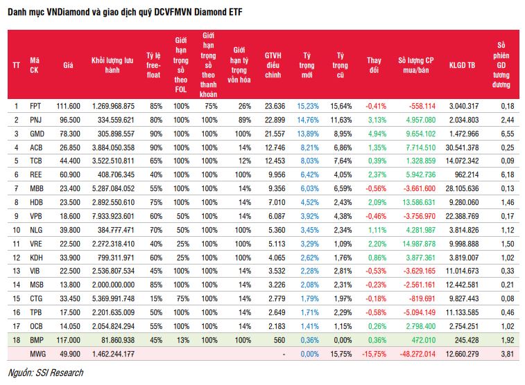 Theo ước tính của SSI Research, quỹ sẽ bán 48.2 triệu cổ phiếu MWG khỏi danh mục, trong khi mua vào khoảng 472,000 cổ phiếu BMP.