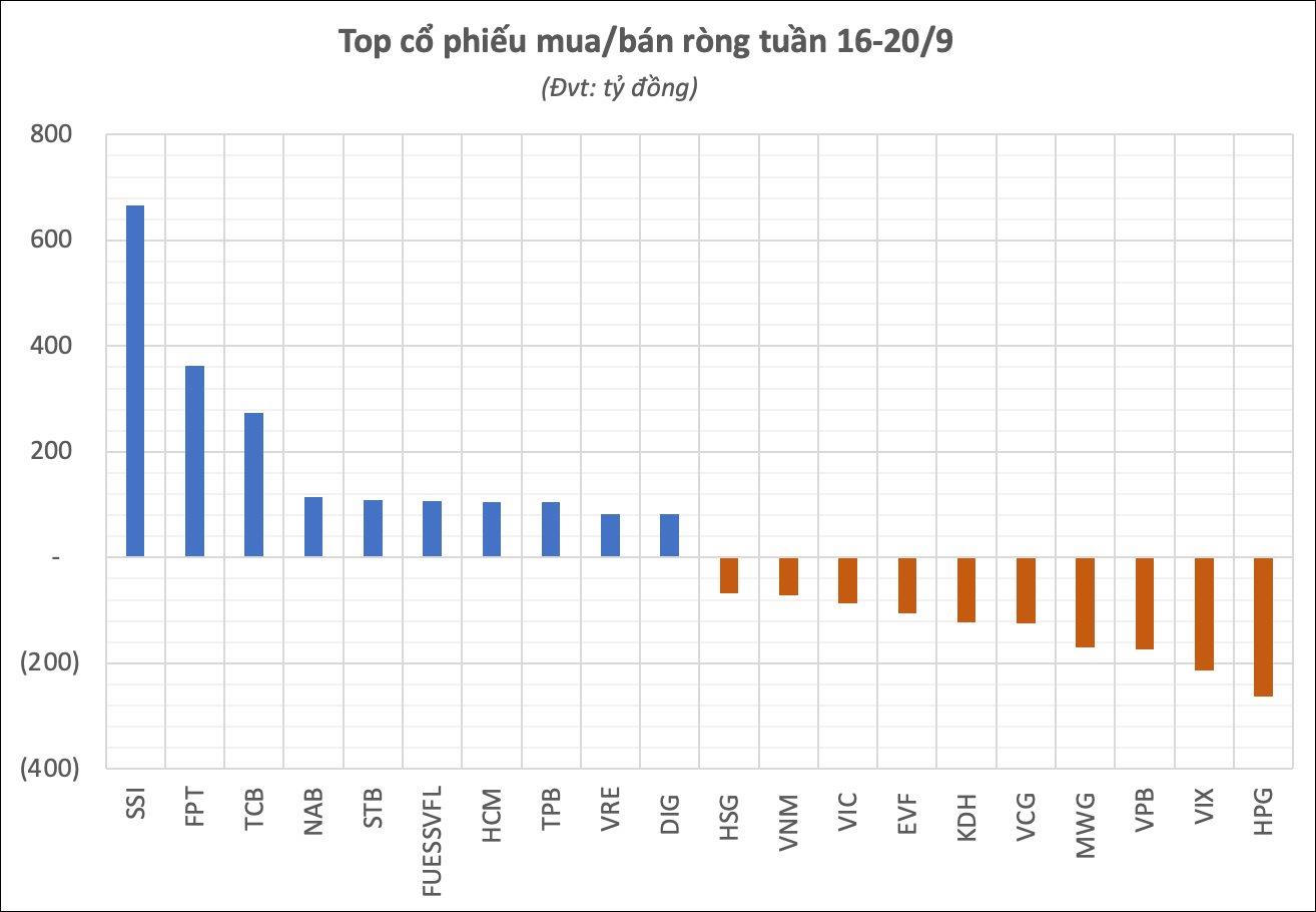 Thống kê theo các mã chứng khoán, cổ phiếu chứng khoán SSI tuần này trở lại thu hút dòng vốn khối ngoại chảy vào, được mua ròng mạnh nhất với 666 tỷ đồng. Khối ngoại cũng giải ngân mua ròng 363 tỷ tại cổ phiếu FPT, đồng thời mua ròng tại TCB với 274 tỷ đồng. Lực mua ròng trong tuần qua còn ghi nhận tại STB, NAB, FUESSVFL,... trong 5 phiên tuần qua, riêng mã NAB được mua ròng 115 tỷ, đây là cổ phiếu được Fubon ETF - quỹ ETF quy mô lớn nhất thị trường - thêm mới vào danh mục tròng kỳ cơ cấu.