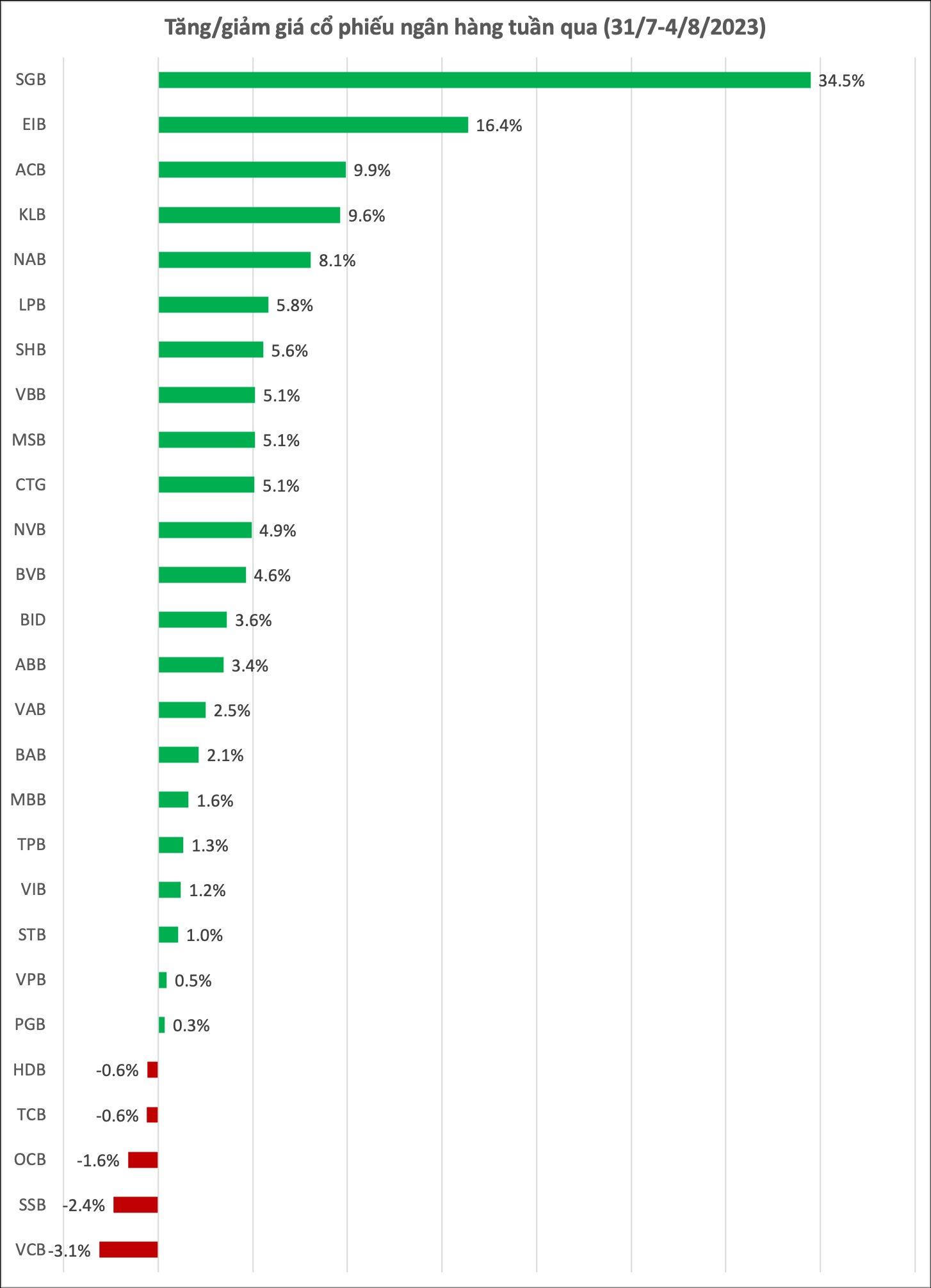 Sau khi kết thúc công bố báo cáo tài chính quý II/2023, cổ phiếu ngân hàng đồng loạt tăng mạnh, với sắc xanh ngập tràn toàn ngành trong tuần qua (31/7-4/8/2023).