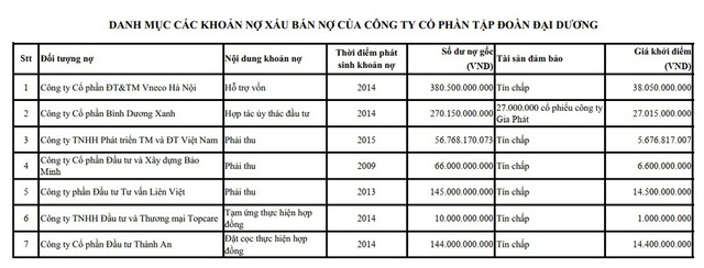 Trong danh mộc các khoản nợ xấu bán nợ của công ty thì thời điểm phát sinh các khoản nợ bắt đầu từ năm 2009 - 2015. Đa phần số nợ này phát sinh trong quá trình lãnh đạo của ông Hà Văn Thắm với tài sản đảo bảo là tín chấp, ngoại trừ khoản nợ của Công ty cổ phần Bình Dương Xanh.