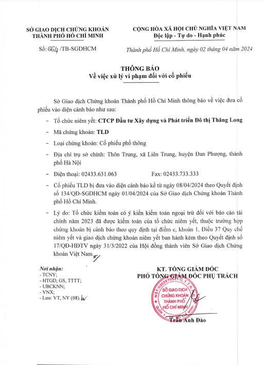 HOSE vừa có thông báo về việc xử lý vi phạm với cổ phiếu của Công ty cổ phần Đầu tư Xây dựng và Phát triển Đô thị Thăng Long. Theo đó, cổ phiếu TLD sẽ vào diện cảnh báo kể từ ngày 8/4.