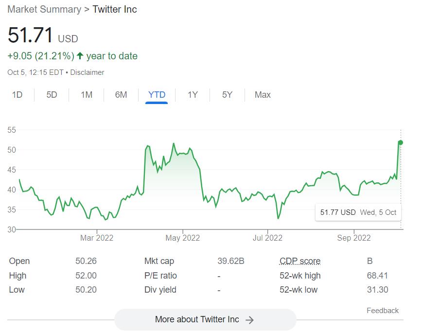 Mức giá mà Musk đề nghị là 54,20 USD/cổ phiếu, nâng giá trị thương vụ lên 44 tỷ USD. Cổ phiếu nền tảng mạng xã hội đóng cửa tăng tới 22% vào ngày 4/10 (theo giờ Mỹ).