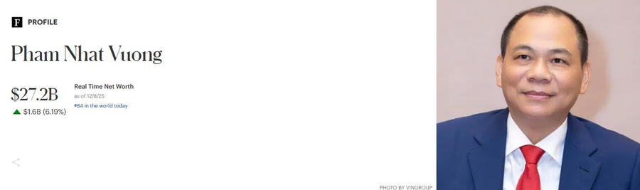 Theo số liệu thời gian thực của Forbes, tính đến ngày 8/12/2025, tài sản của ông đã đạt 27,2 tỷ USD, tăng thêm 1,6 tỷ USD chỉ trong một ngày. Thành tích này đưa ông lên vị trí thứ 84 trong danh sách những người giàu nhất thế giới và thiết lập mức kỷ lục mới tại Việt Nam.