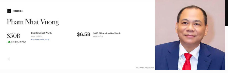 Theo dữ liệu cập nhật từ Forbes, khối tài sản của Chủ tịch VinGroup - ông Phạm Nhật Vượng hiện đạt 30 tỷ USD, xếp thứ 535 trên thế giới.