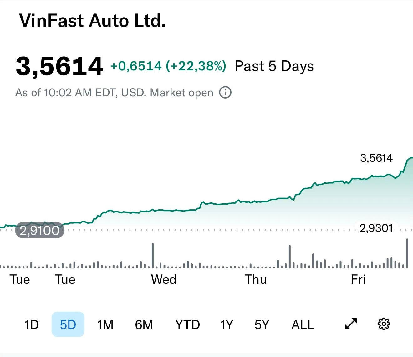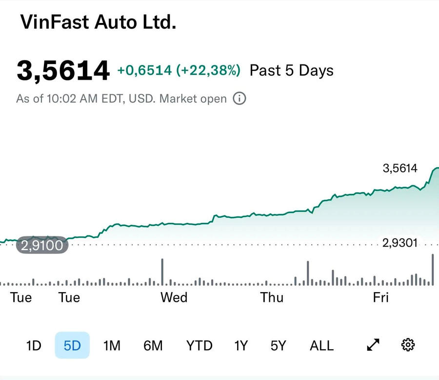 Phản ứng trước những dữ liệu tài chính tích cực, mở cửa phiên giao dịch ngày 30/3 (theo giờ Mỹ), cổ phiếu VFS của VinFast Auto lập tức tăng mạnh. Tính trong 5 phiên giao dịch gần nhất, mã chứng khoán này đã bật tăng hơn 22%, vượt mức 3,56 USD/cổ phiếu. Tại mức giá hiện tại, vốn hóa thị trường của hãng xe điện gốc Việt đạt hơn 8,12 tỷ USD.