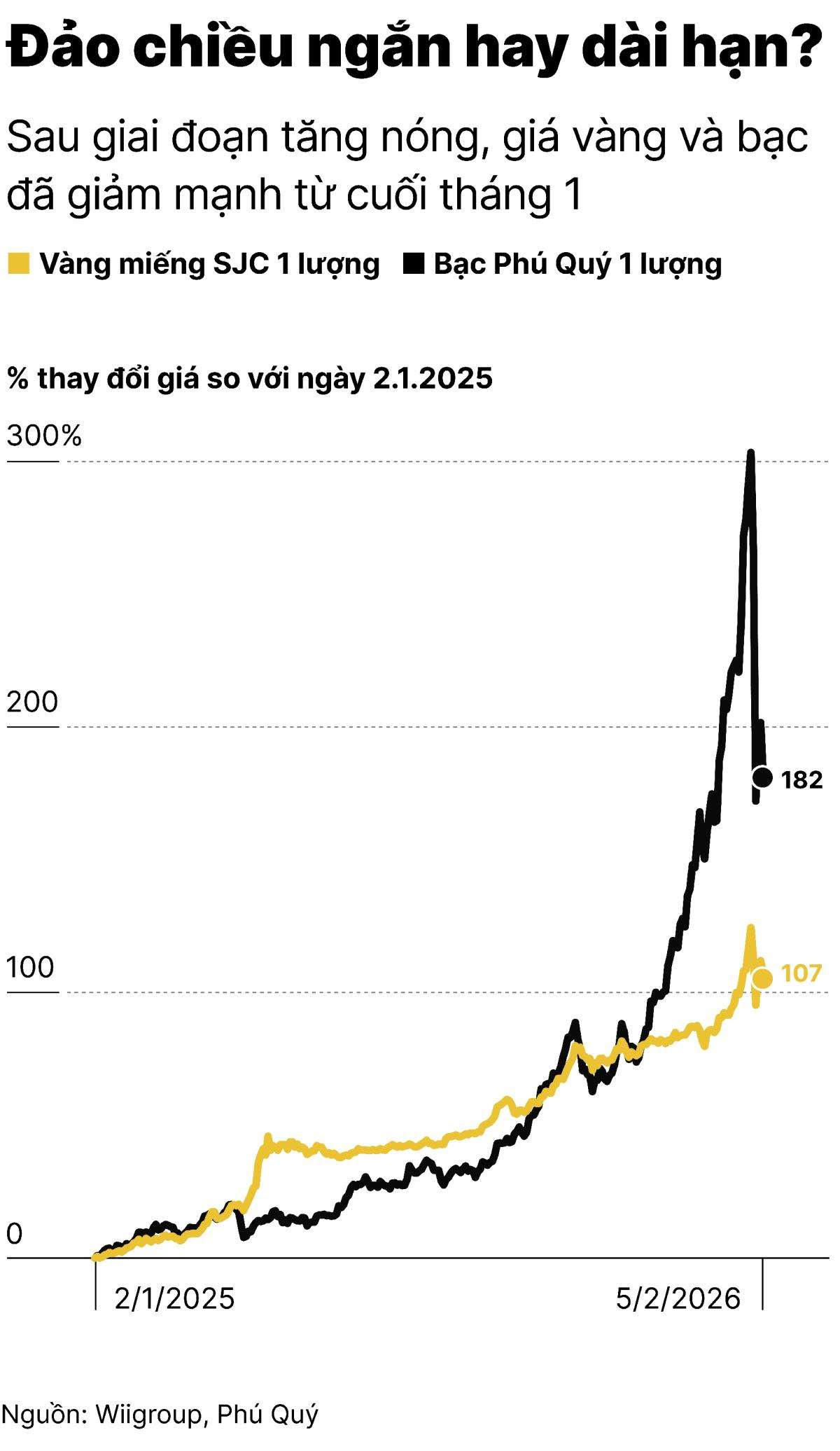 Sau khi thiết lập đỉnh vào ngày 29/1/2026, giá vàng đã giảm khoảng 13% xuống mốc 166 triệu đồng/lượng vào phiên 2/2. Bạc chịu áp lực bán mạnh hơn với mức giảm hơn 32% chỉ trong vài ngày, rơi về vùng giá 3,07 triệu đồng/lượng.
