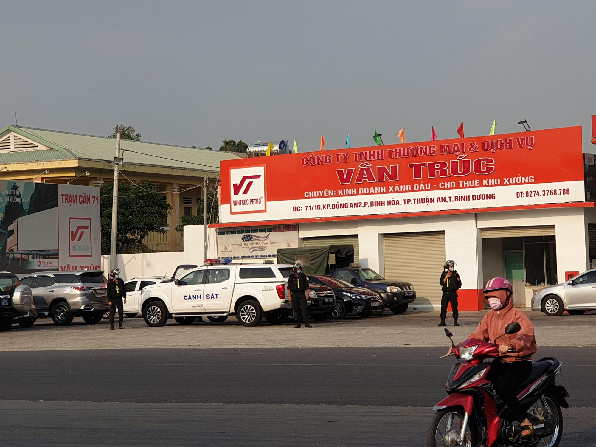 Tại một cây xăng Vân Trúc trên đường ĐT743, thuộc phường Bình Hòa, thành phố Thuận An, Bình Dương, theo ghi nhận sáng 9/3, hàng chục cảnh sát cơ động bảo vệ vòng ngoài.