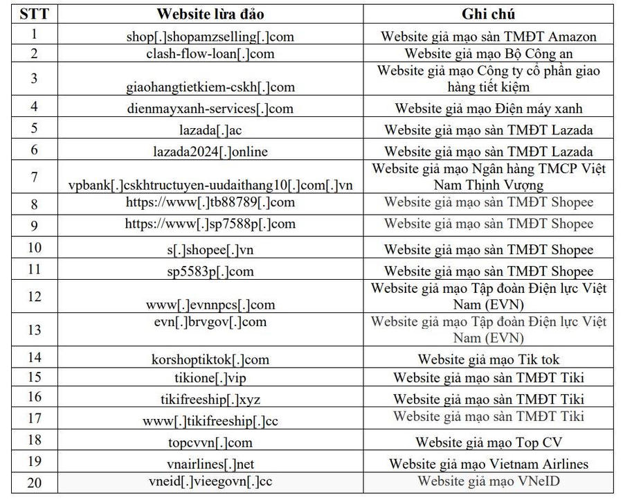 Ngoài ra, NCSC cũng cảnh báo các đường link giả mạo Bộ Công an, Giao hàng Tiết kiệm, Điện máy xanh, VPBank, EVN, TopCV, Vietnam Airlines và VNeID.