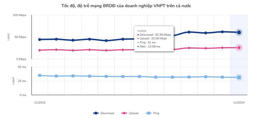 Xếp ở vị trí thứ hai là nhà mạng Vinaphone, với tốc độ Internet tải xuống là 60,39 Mbps, giảm 1,26 Mbps so với tháng 10/2024.